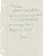 Late December 1988 "Paisley Park" Chanhassen Flash/MC Flash (1st Album) We Can Hang (Re-Recording) "Work It 2.0 Updated Vol.4"( D16) (3:00) December 26. 1988 "Paisley Park" Chanhassen Curious Blue ■ (Basic Tracking) December 27. 1988 "Paisley Park" Chanhassen Flash/MC Flash (1st Album) Curious Blue (Vocal Overdubs) (Vocals. Margie Cox) "Work It 2.0 Updated Vol.4"( D16) (6:15) Brand New Boy (Basic Tracking) (Vocals. Prince) "The Work Volume 3"( D4) ![]() プリンスによる署名のない鉛筆の手書きのメモ。プリンスのアシスタント、テレーズ・ストゥーリルのコレクションから。「テレーズ、'Brand New Boy'の歌詞をテープ(トラック16)から直接書き写し、マージー・コックスに至急送ってください。ありがとうございます。」プリンスは1988年12月27日にペイズリー・パーク・スタジオで未発表曲「Brand New Boy」を録音した。マギー・コックスは1989年1月5日にボーカルを追加し、この曲はアルバム「Flash/MC Flash」の2曲目として収録される予定でした。しかしこの企画は最終的に中止された。 (RR Auction) |
